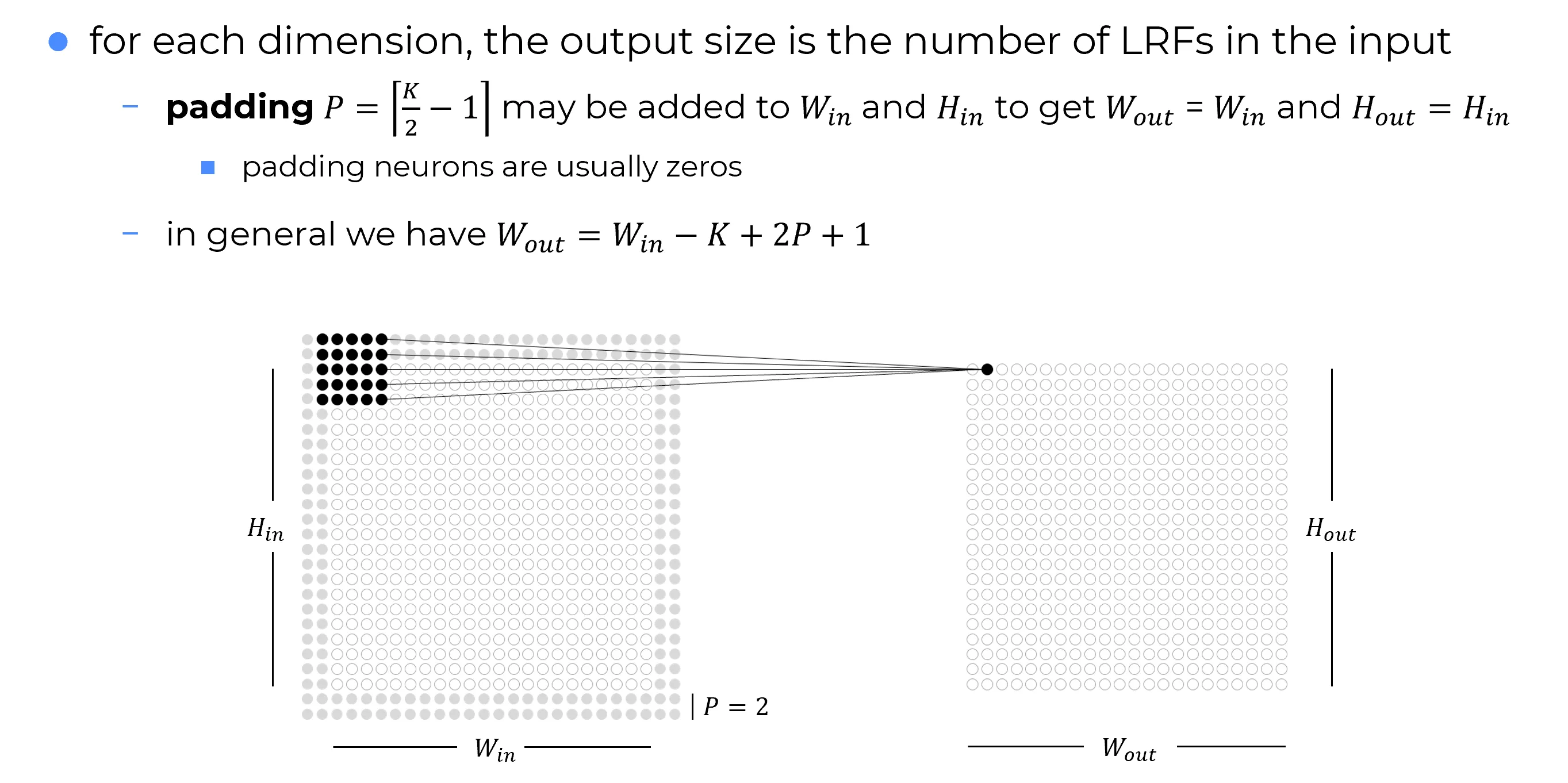 Per determinare la dimensione dell’output (Wout), bisogna contare in quante posizioni distinte il local receptive field (LRF), di dimensione K, può scorrere lungo la dimensione effettivaWeff.