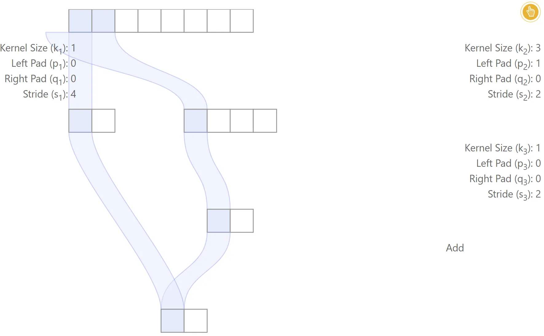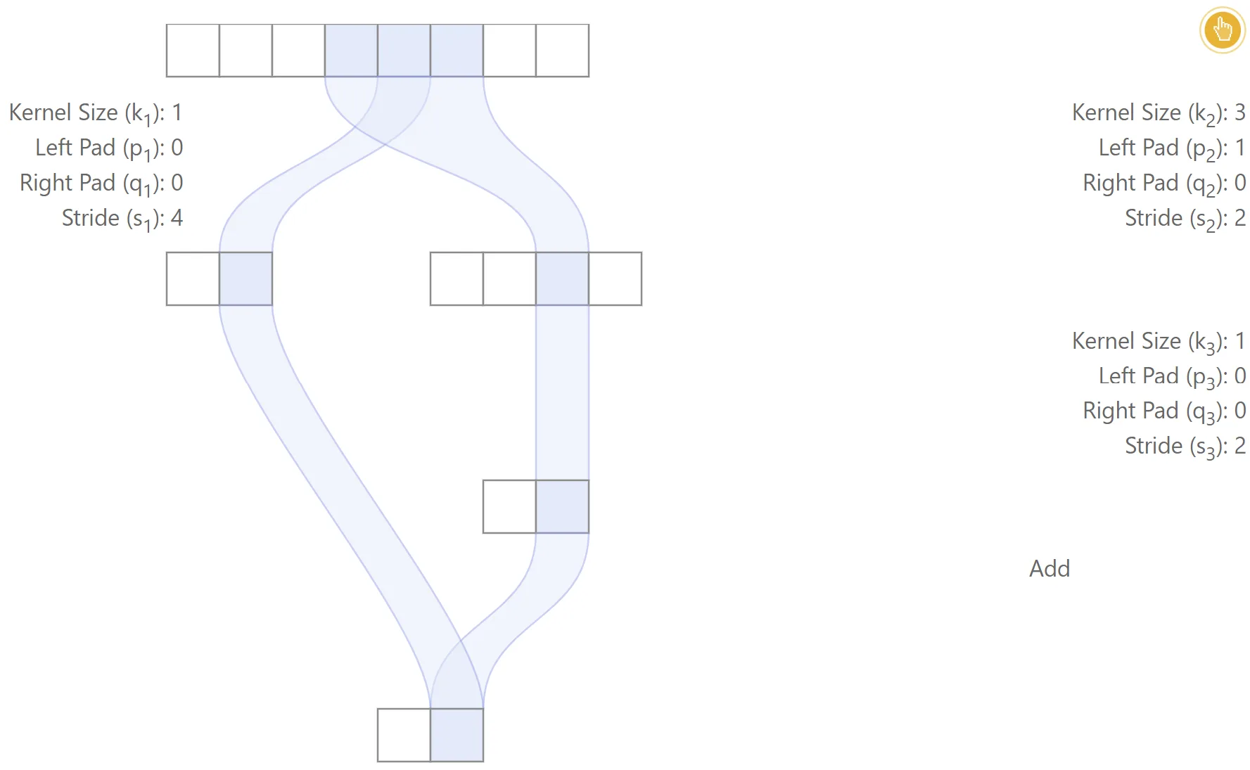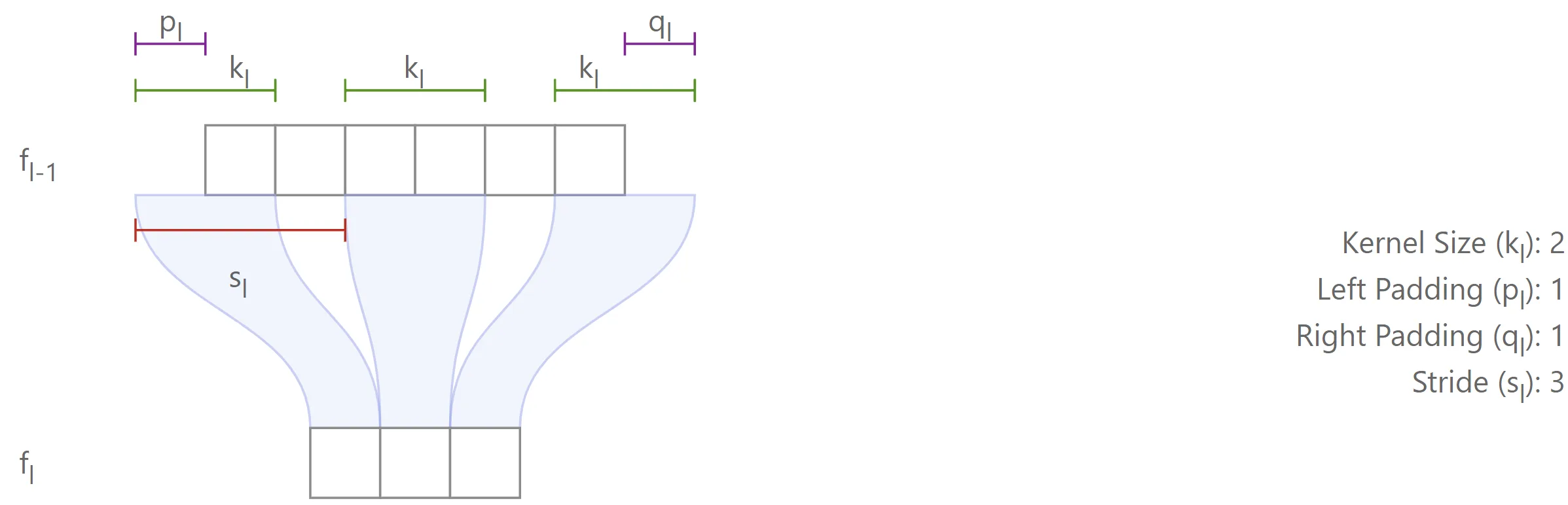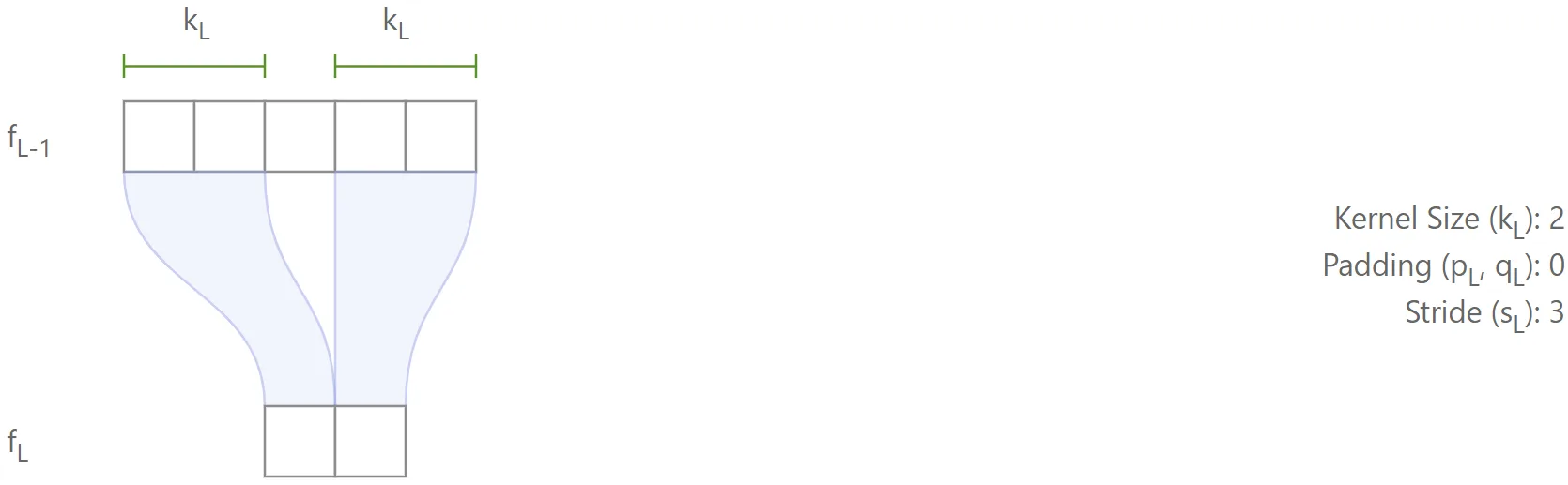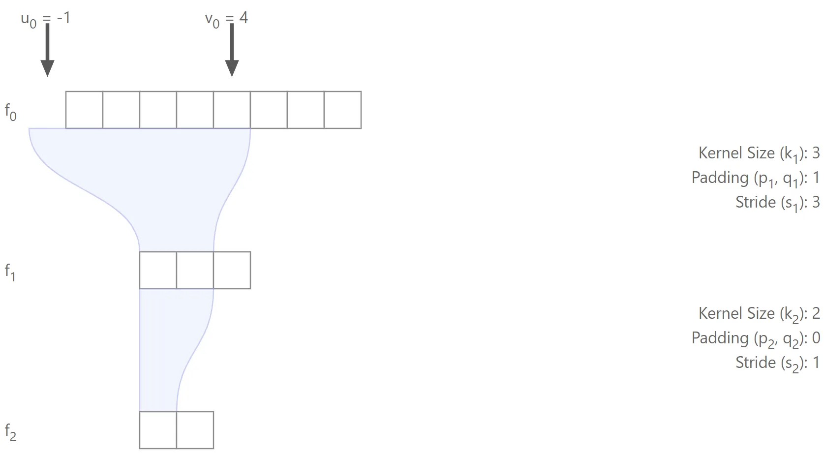 It is also possible to derive recurrence equations for the effective stride and effective padding. It is straightforward to show that: