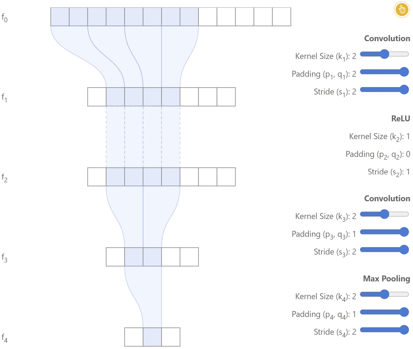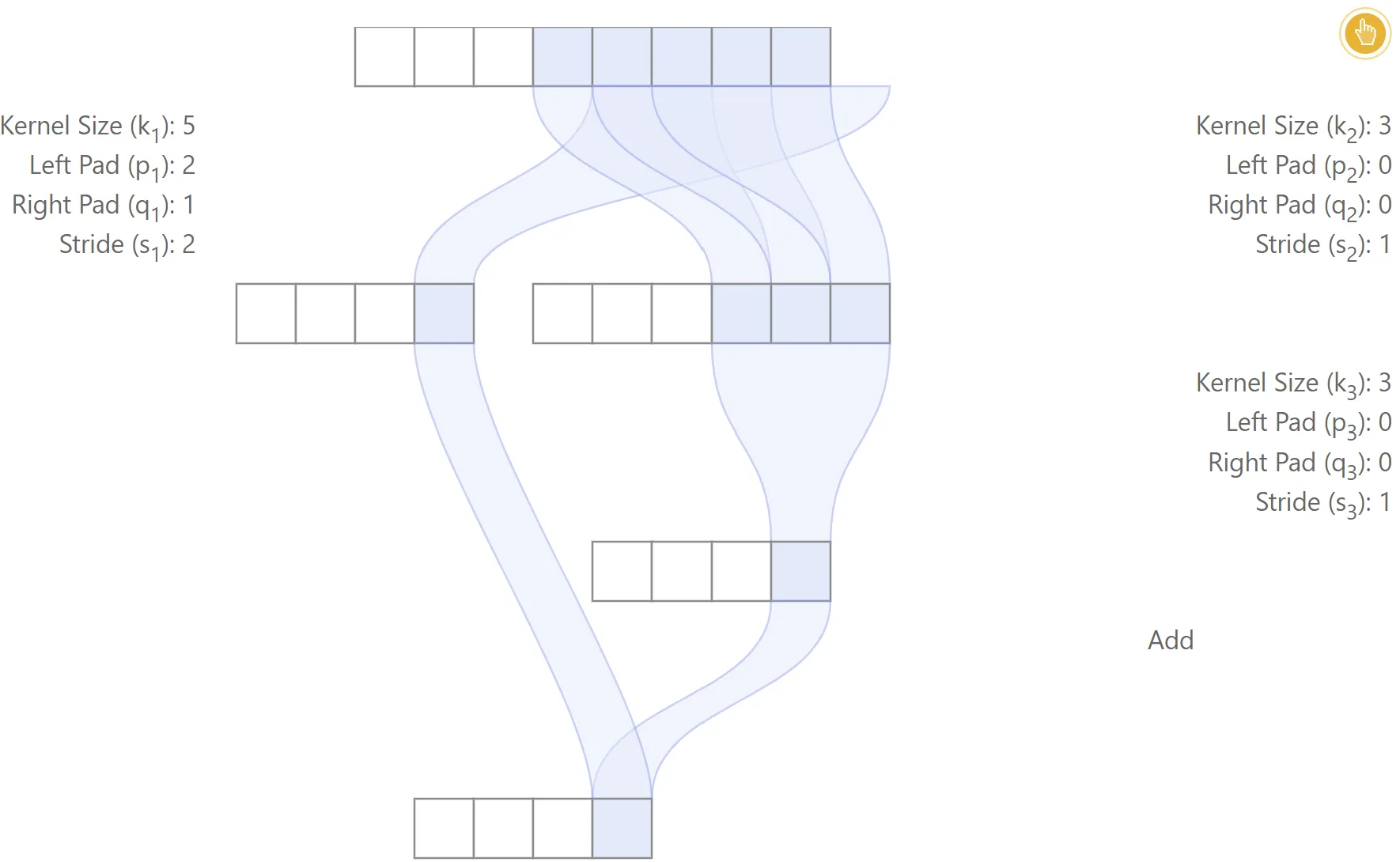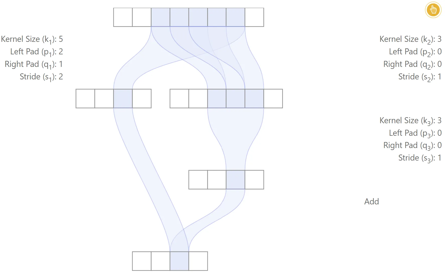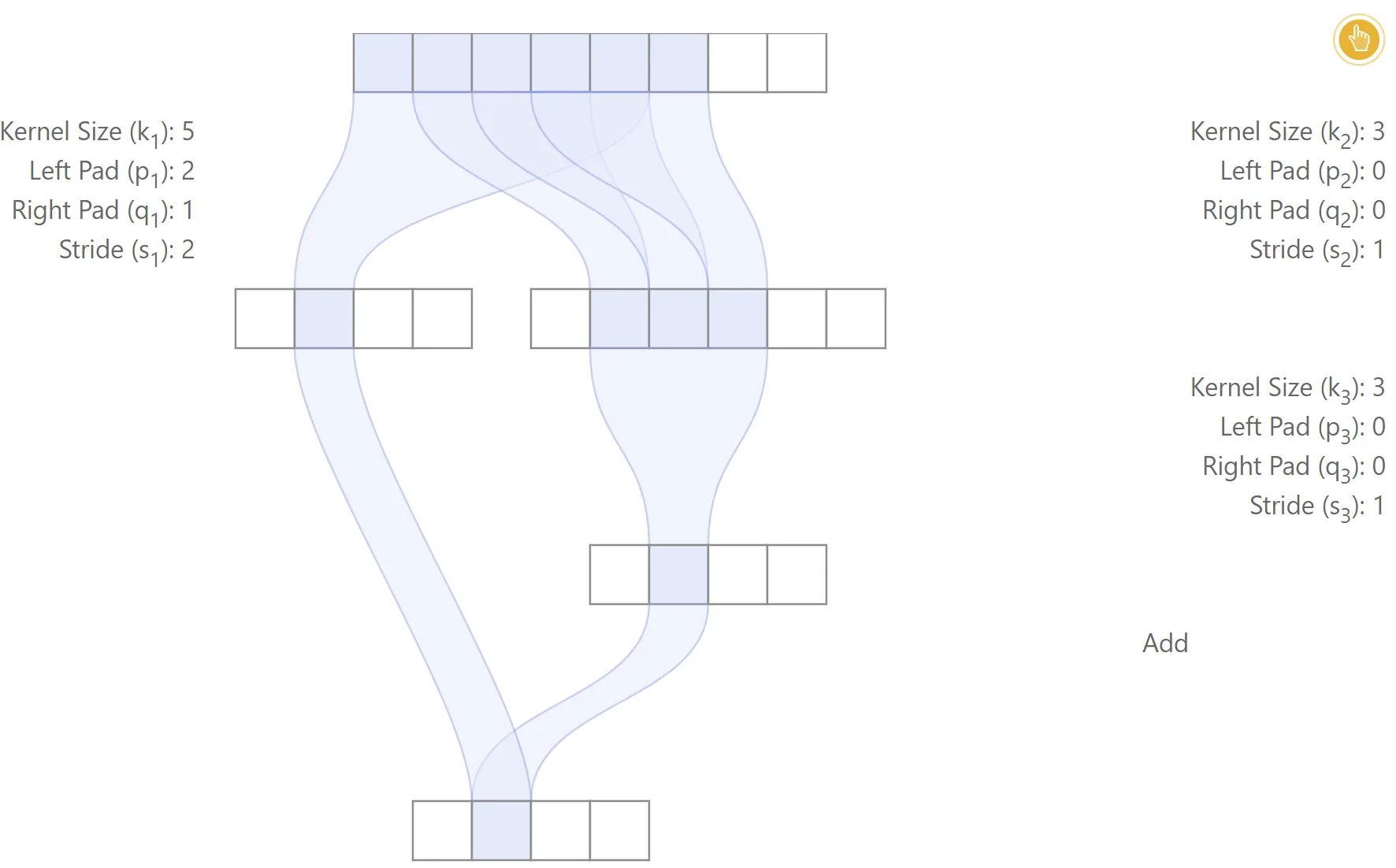 It is also possible to derive recurrence equations for the effective stride and effective padding. It is straightforward to show that: