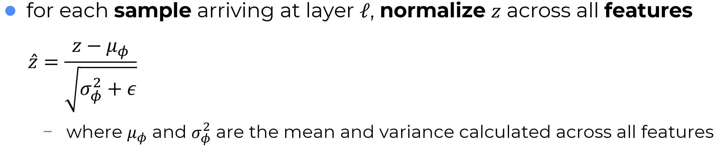 Tuttavia, con la Layer Normalization, la normalizzazione non viene più effettuata lungo la dimensione del batch (cioè non si fissa piu un neurone e si normalizza sui tutti i campioni del mini-batch), ma lungo la dimensione dei neuroni (o feature, nel caso delle CNN) (cioè si fissa un campione del mini-batch e si normalizza rispetto ai neuroni del layer che si sta considerando).