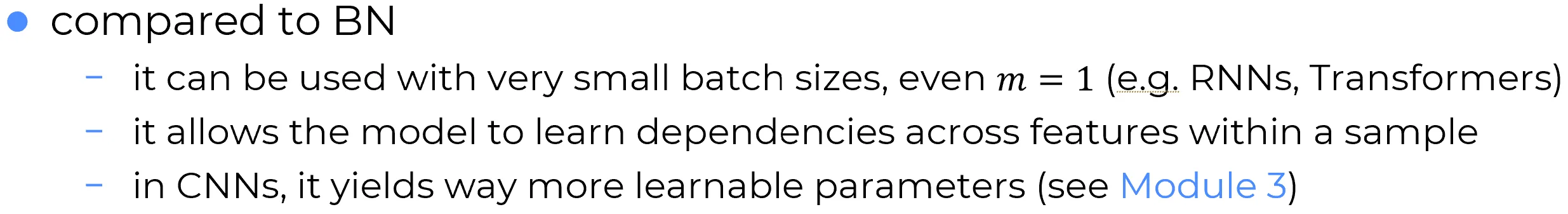 - LN: molti più parametri nelle CNN, poiché lavora su tutte le dimensioni e non solo per feature