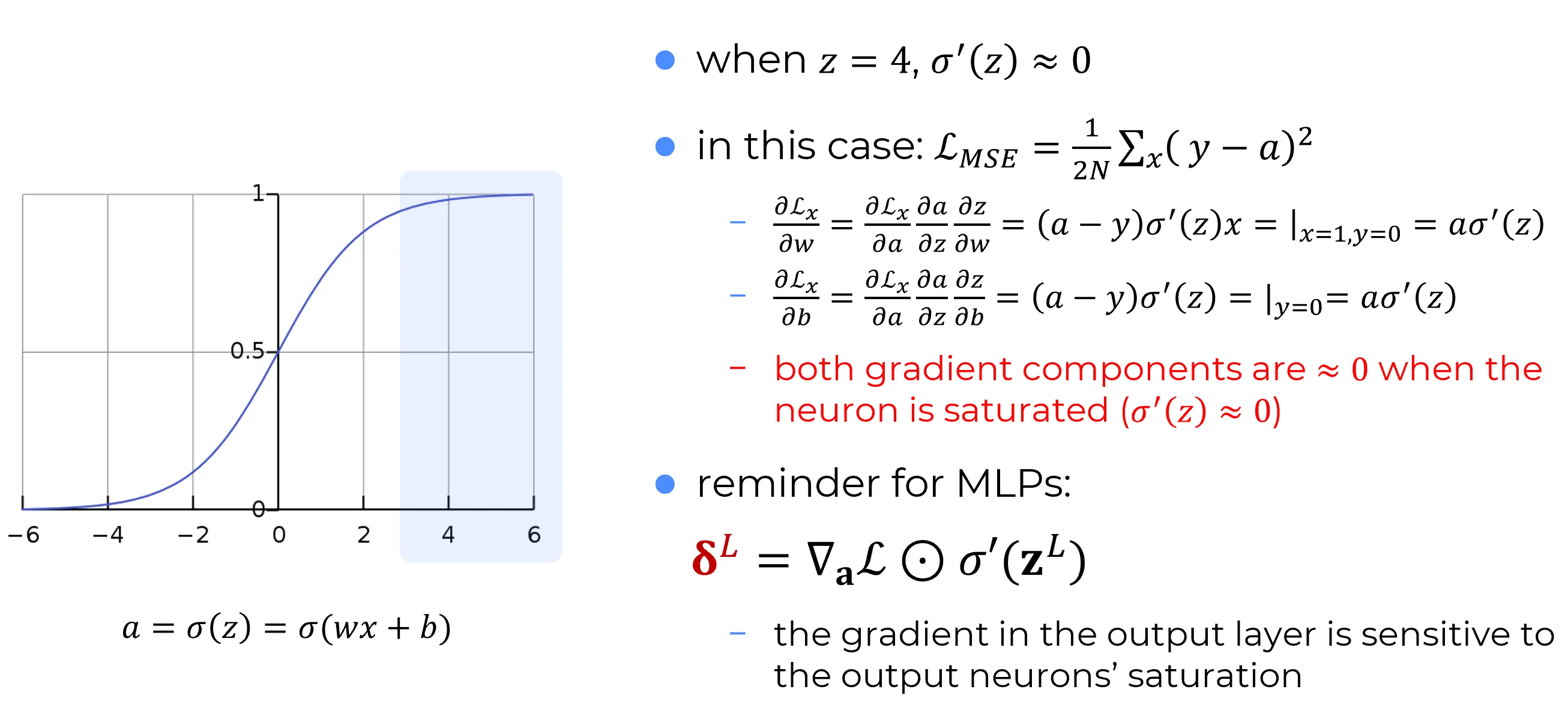 the sigmoid function is nearly flat, and its derivative is close to zero.🧠 The crucial point is that when using the MSE loss function,