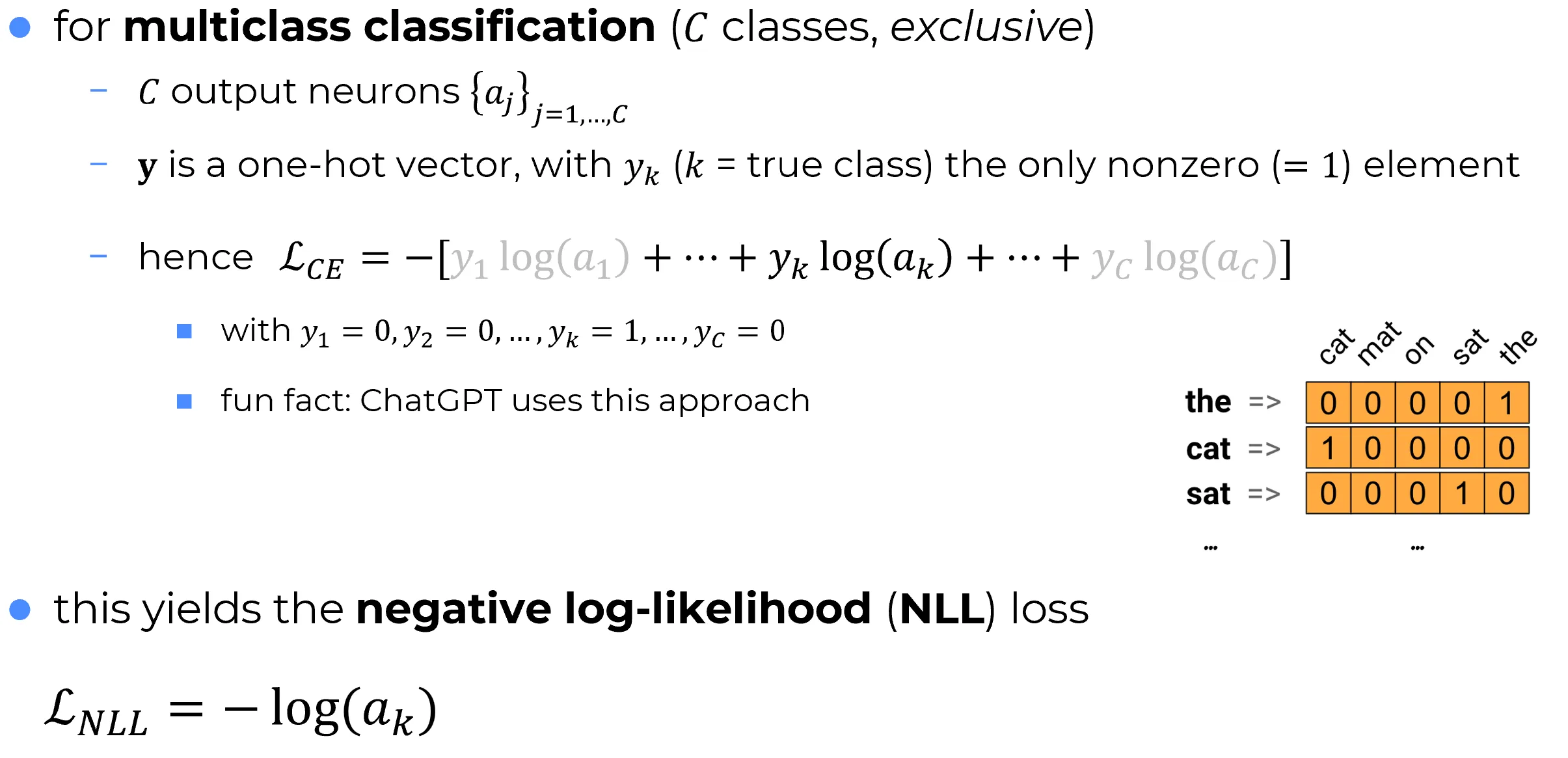 In tal caso si hanno tanti neuroni in uscita quante sono le categorie, ma l’uscita desiderata della rete neurale, fissato un certo campione di ingresso, è un one-hot vector, ovvero un vettore che assume valore nella posizione corrispondente alla classe corretta, e in tutte le altre posizioni (exclusive classification):
