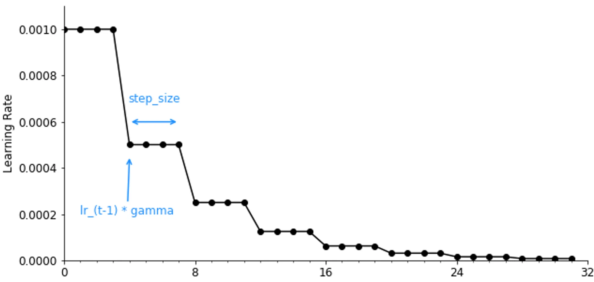 step_size = 4 epochs, in the figure), the learning rate is multiplied by (e.g., ). - This produces a staircase-like profile, where each sharp drop is followed by a plateau of stability.
