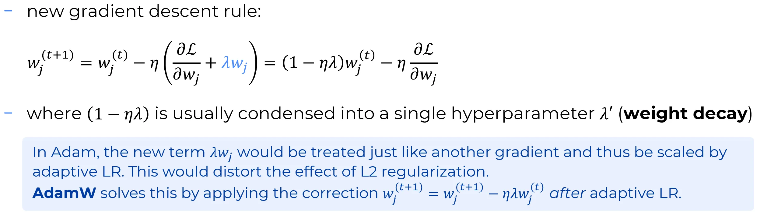 - Second phase: apply weight decay as a separate update, subtracting a term proportional to , scaled only by the learning rate , after adaptive LR.
