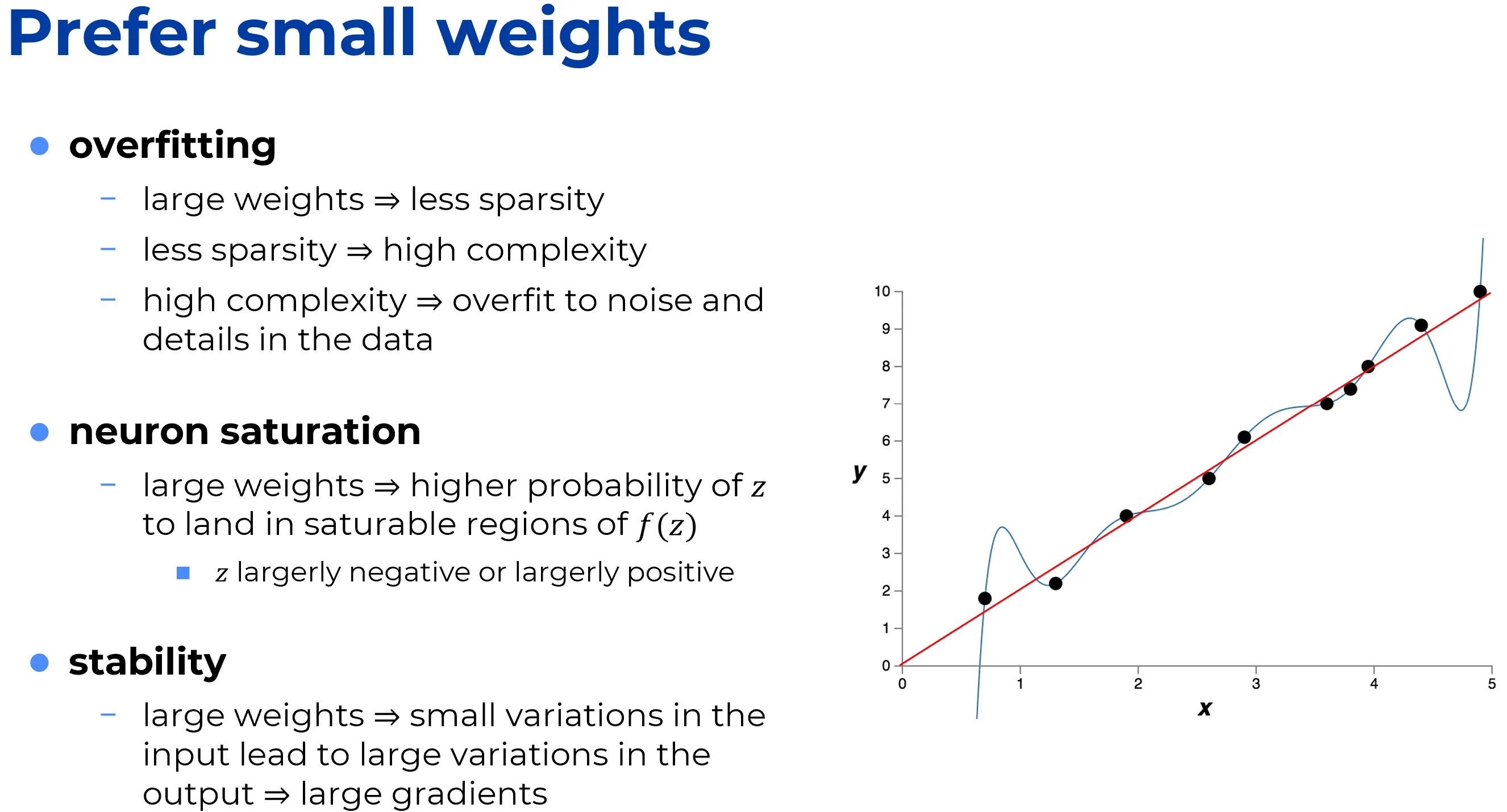 Per contrasto, una rete non regolarizzata, con pesi elevati, può modificare notevolmente il proprio comportamento anche in risposta a piccole variazioni negli input.