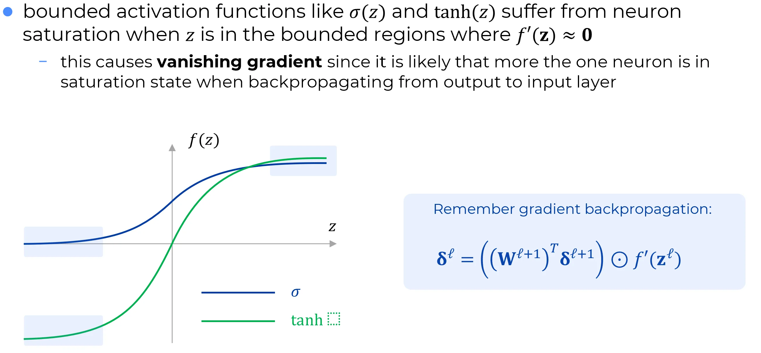 Infatti, stante la , qualora l’input netto del neurone sia tale da saturare il neurone, ossia cada nelle regioni estreme della funzione di attivazione dove , la componente del gradiente relativa ai parametri di quel neurone si pressoché annulla (), contribuendo al fenomeno del vanishing gradient.