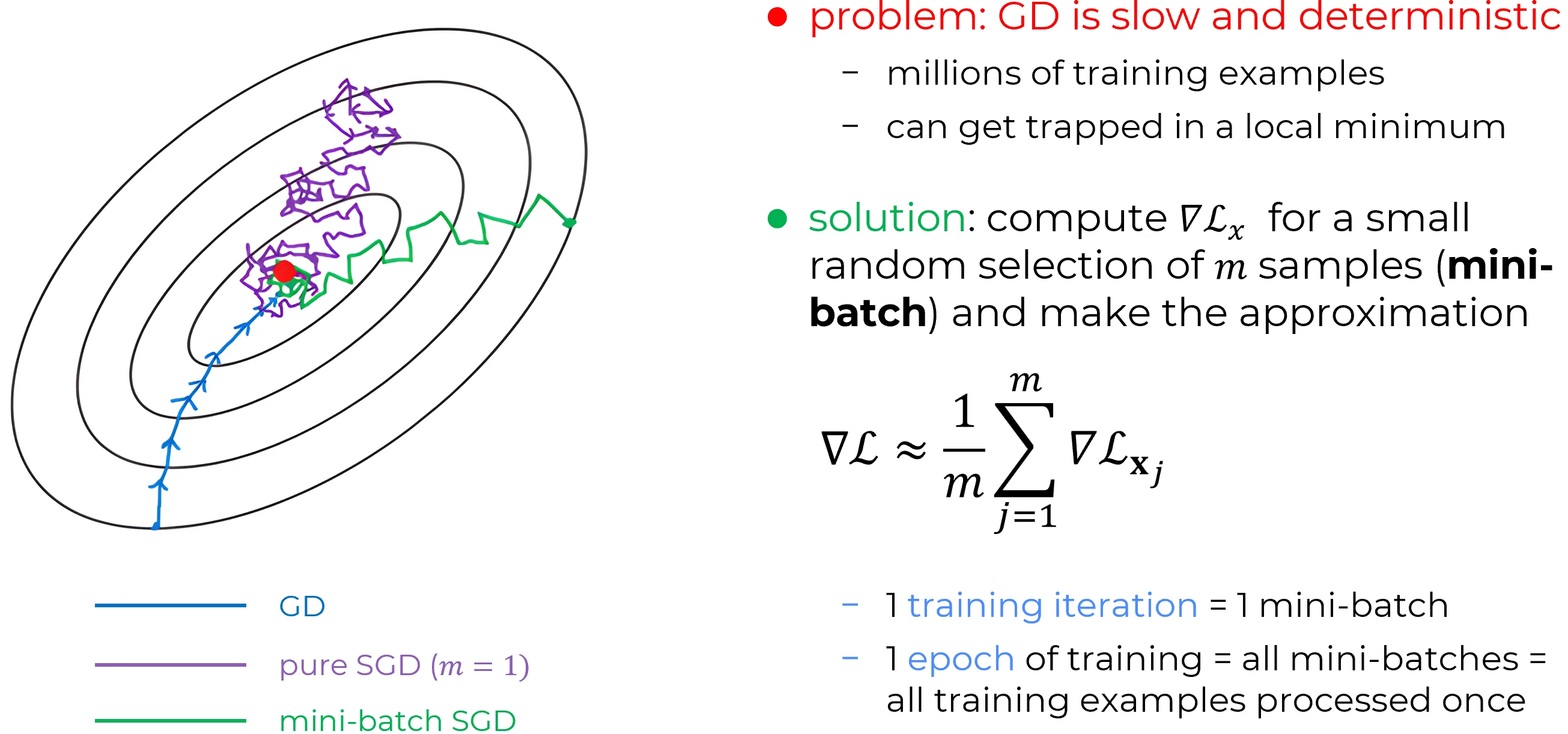 The central idea is to approximate the full gradient by computing it on a small, randomly selected subset of the training data, rather than over the entire dataset.
