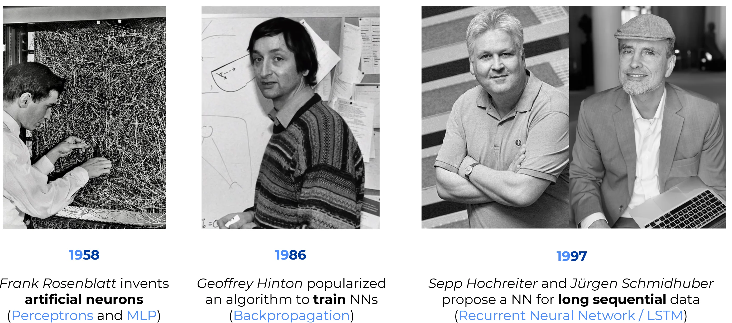 | 1958 | Perceptron | First learnable pattern classifier; established the “learning from data” paradigm. |