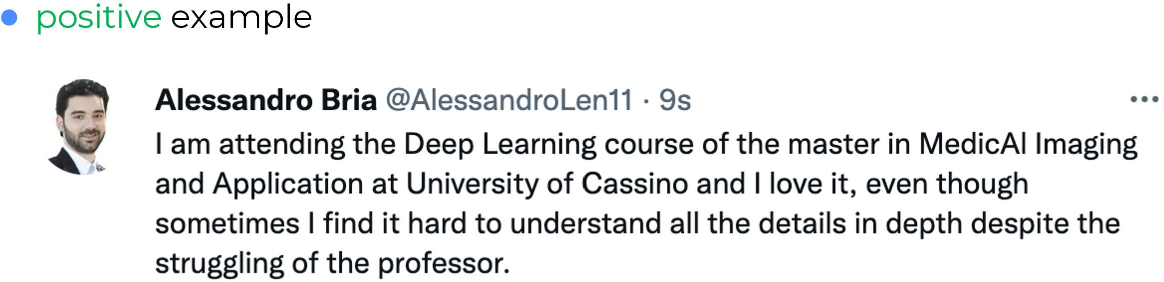 The figure below illustrates an example of positive valence, represented by a tweet composed by the professor, who has adopted the point of view of a student enrolled in his own course.