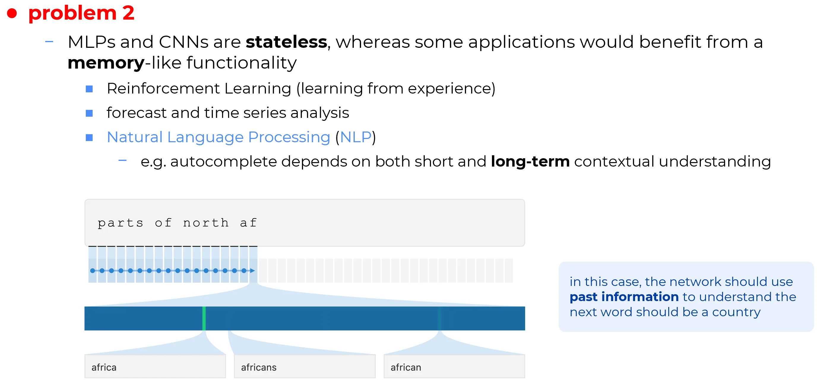 MLPs and (partially) CNNs are not designed for sequential data instead they are usually designed for fixed sized data: an image is bounded whereas sequential data have variable lengths