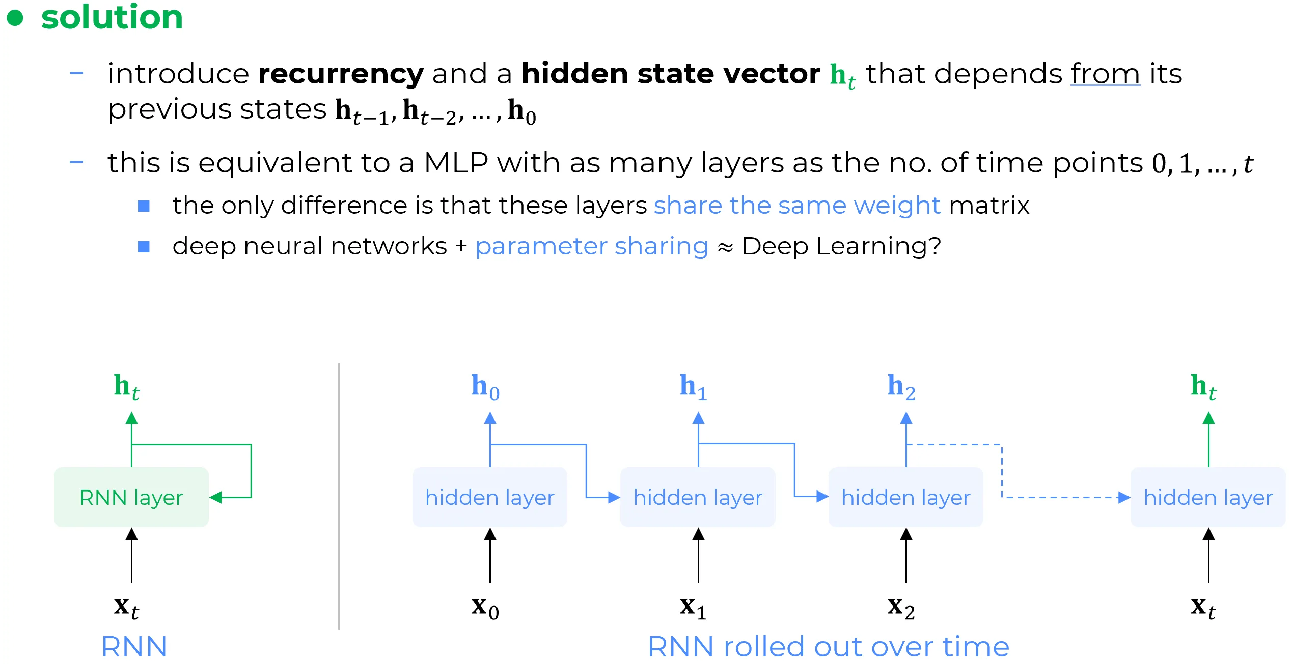 Furthermore, since those hidden layers are actually all the same layer which is enrolled through time. Therefore the unrolled architecture on the right in the above picture is equivalent to a many layers MLP where the parameters of these layers are all the same: so this is parameter sharing. So that unrolled architecture on the right has in itself both the concept of and parameter sharing which are the constitutive components of deep learning paradigm.